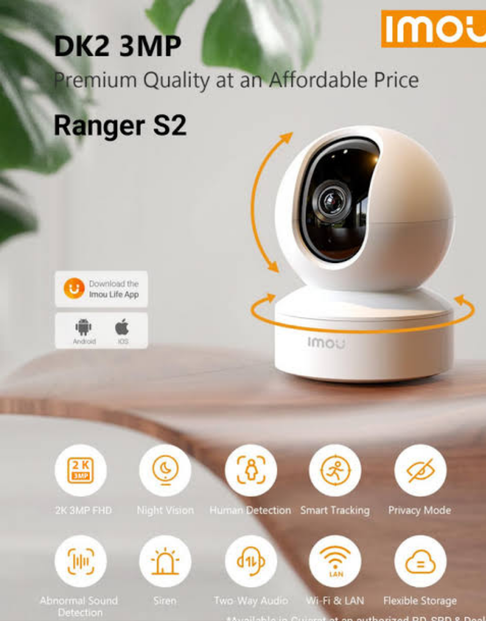 The IMOU Ranger S2 is a 3MP (2K) WiFi security camera with 360° pan and tilt, providing complete coverage without blind spots. Key features include AI human detection, smart tracking, abnormal sound detection, and privacy mode for enhanced security and convenience. It also offers two-way audio, night vision, and supports Micro SD cards for local storage, with an optional cloud subscription service available. The camera can be controlled via the Imou Life App on smartphones and is compatible with Amazon Alexa and Google Assistant for voice control.